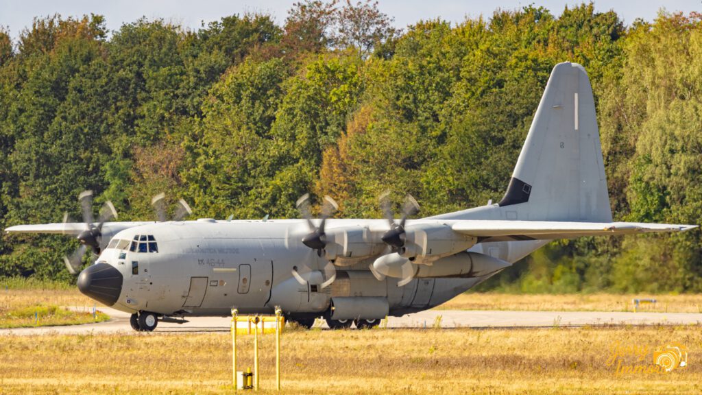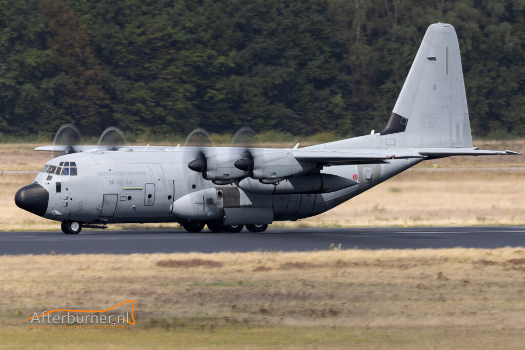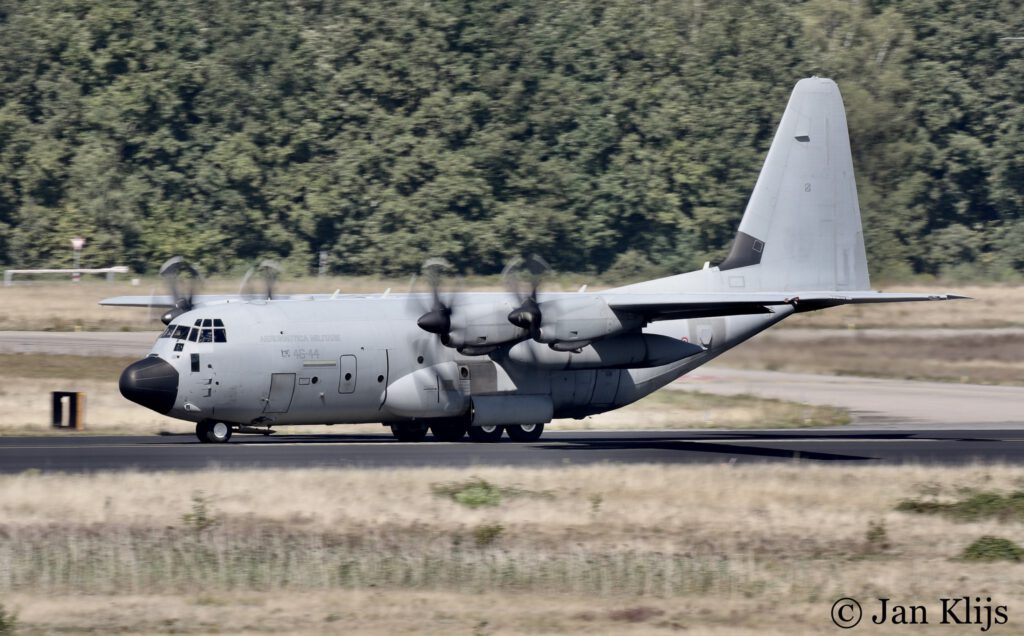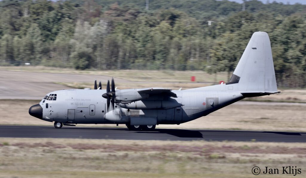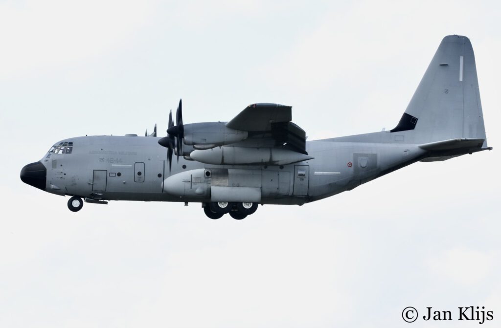 7-9-2025 Een van de eerste deelnemers voor de oefening Falcon Leap die morgen van start gaat de eerste Herc die vandaag al naar VLB Eindhoven kwam was de C-130J Super reg 46-44 van de Italiaanse Luchtmacht mooi op de foto gezet in landing vanaf P4 door Rob Martaré bedankt!