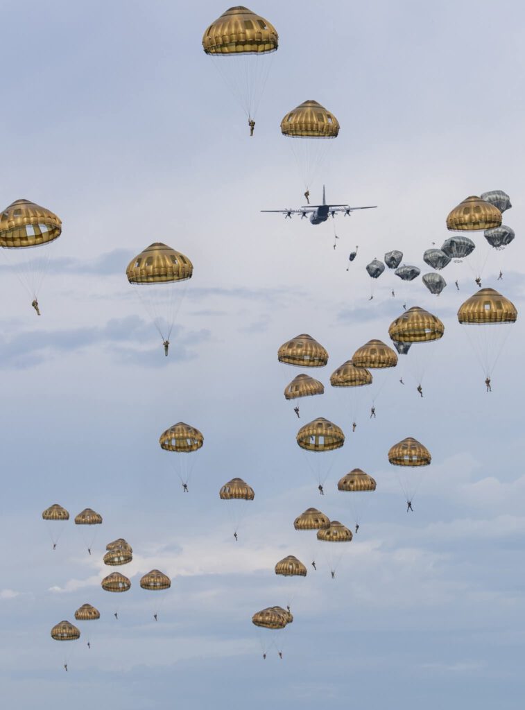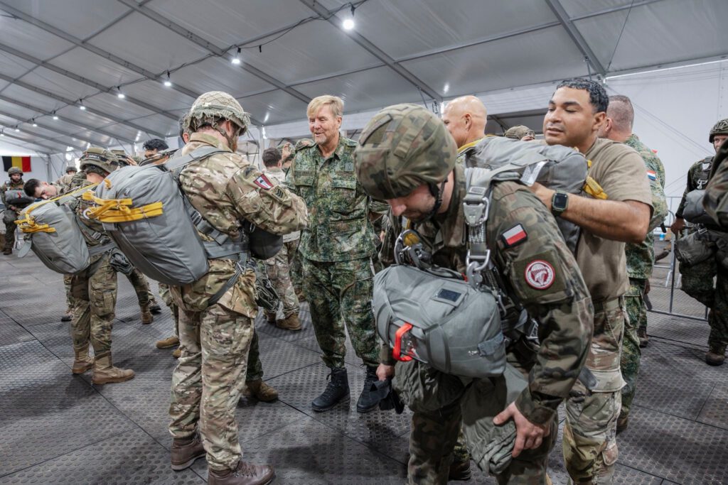 De Luchtmobiele Brigade en het Air Mobility Command (AMC) traint het droppen van vracht en parachutisten boven Nederland. Koning Willem-Alexander bezoekt de internationale luchtlandingsoefening Falcon Leap op Vliegbasis Eindhoven.