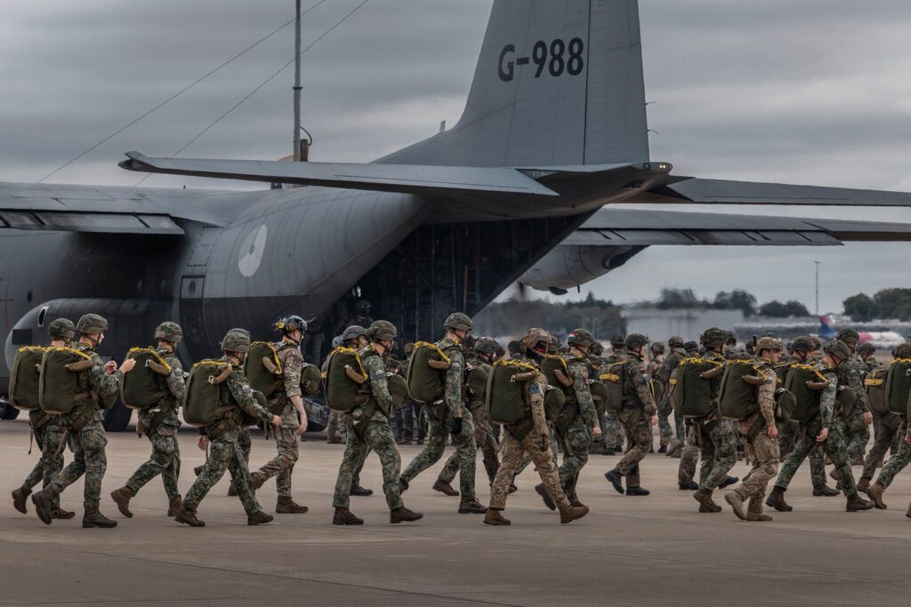 Op Twente Airport worden weer luchtlandingsoperaties uitgevoerd met vliegtuigen die militaire voertuigen op de grond afzetten.