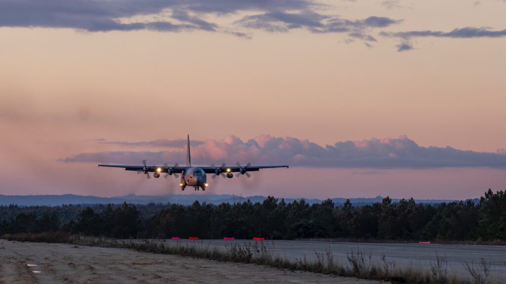 C-130J SUPER LANDS AT NIGHT ON SHAPE AIRFIELD
