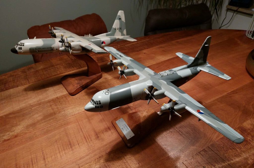 20-1-2026 Kreeg vanvond een Foto van Frank van den Hurk die had eindelijk de twee decast modellen van hout als twee broertjes bij elkaar verzameld de RNLAF C-13H-30 G-273 en G-275 in de mooie twee tinten grijs ook leuk de een met zwarte neus en de ander met grijs !